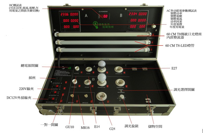 - 外接測試功能:通過線夾和萬能插坐進行擴展。可以通過外接延長線外接展示測試和對比LED的燈管和傳統燈管(需接整流器)。