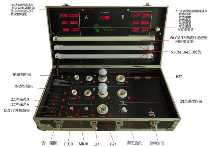 - 外接測試功能:通過線夾和萬能插坐進行擴展。可以通過外接延長線外接展示測試和對比LED的燈管和傳統燈管(需接整流器)。